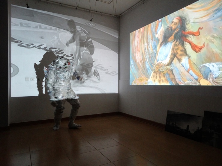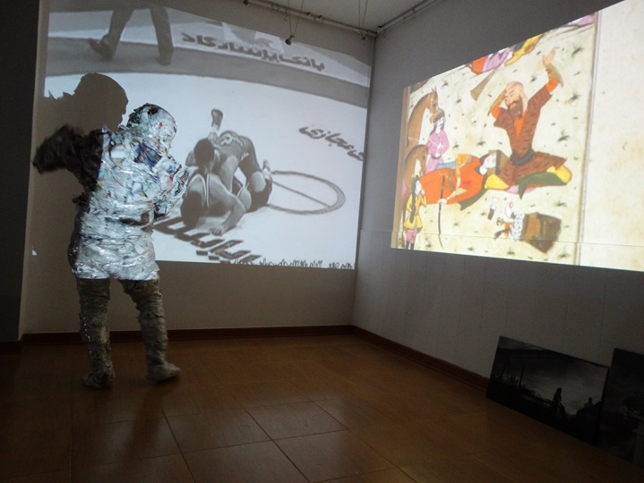 بر یک پرده ( یک سمت دیوار گالری) مینیاتور های نبرد رستم و سهراب نمایش داده می شود و بر پرده ای دیگر (سمت دیگر دیوار گالری) نبرد کشتی گیران ایرانی و پیروزی هایشان در برابر رقبا؛ برای حفظ غرور و هویت ملی چاره ای به جز پیروزی نیست. کشتی از بین ورزش ها بیش از همه این ورزش کشتی است که نام ایران را به گوش جهانیان رسانده است همانند ساز تار که شناخته شده ترین ساز ایرانی است.