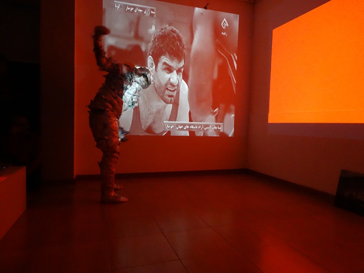 چیدمان و نصب لوازم این برنامه نیز جزیی از اثر بود. پس از چیدمان و نصب دستگاهها، دو بازیگر در حالیکه دو پارچه سیاه و سفید بر سر داشتند وارد صحنه شدند. در گوشهای از صحنه نشستند و وقتیکه پارچهها کنار رفت هر دو سر تا پا با روزنامه پیچیده شدهبودند. هنرمند پارچهها را به کمک یکی از مخاطبان در هم پیچیده و داریرهوار بر زمین گذاشت و توسط دیگر مخاطب روبانهای قرمز را قیچی کرده و از مرکز دایره تا دو بازیگر نشسته بر زمین امتداد داد. سپس بر دو دیوار مقابل بازیگران اجرا دو ویدئو پخش شد؛ بر روی یکی از دیوارها صحنه هایی از رد و بدل شدن فنون کشتی های جام جهانی و بر دیوار دیگر صحنه هایی از نگارگریهای “رزم رستم و سهراب” که با صدای تار درآمیخته بودند. با شروع اجرای بازیگران ابتدا صحنهای از غلبه سهراب بر رستم با شعری که مخاطبی از درون جمعیت بلند میخواند تداعی میشد. و در ادامه یکی از بازیگران به جلوی صحنه میآمد و گویی رستم بود که داشت برای نبرد فردا با خود گفتگویی درونی داشت. سپس باز میگشت و بر سهراب چیره میشد و در چرخشی از غم و اندوه بر جسد سهراب میگریست. روایتی از نقشی که اسطوره در زندگی انسان امروز و به خصوص شهروند این مرز و بوم بازی می کند. انتخاب ساز تار که در گوشهی ابوعطا می نواخت به مانند راوی آگاه این اجرا بود چرا که پیشاپیش بر پیکر کشتهی سهراب مویه و زاری میکرد اما از نواختن دست نمی کشد و در عین می داند که در حفظ این مرز و بوم چاره ای جز فدا شدن سهراب نیست. نگارهها به تربیت روایت چیدمان شدهبودند. کشتی از میان دیگر ورزشها بیش از همه نام ایران عجین است همانند ساز تار که شناخته شدهترین ساز ایرانی است. دو نفر از تماشاگران در سه بخش از اجرا چند بیت از نبرد رستم و سهراب شاهنامه را با صدای بلند میخواندند و با اجرا همداستان میشدند و شاید رستم را در انجام وظیفهای که بر گردن اوست تشویق میکردند.